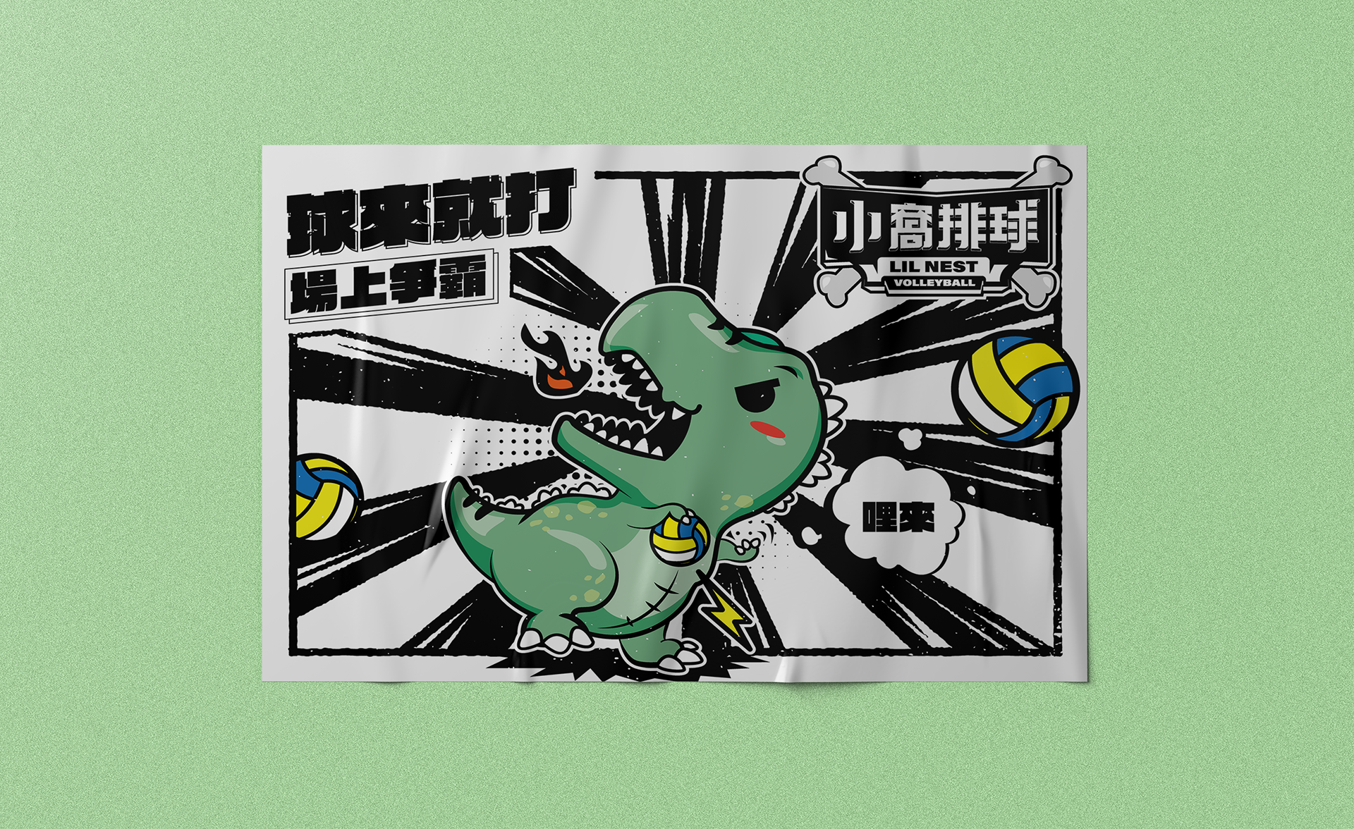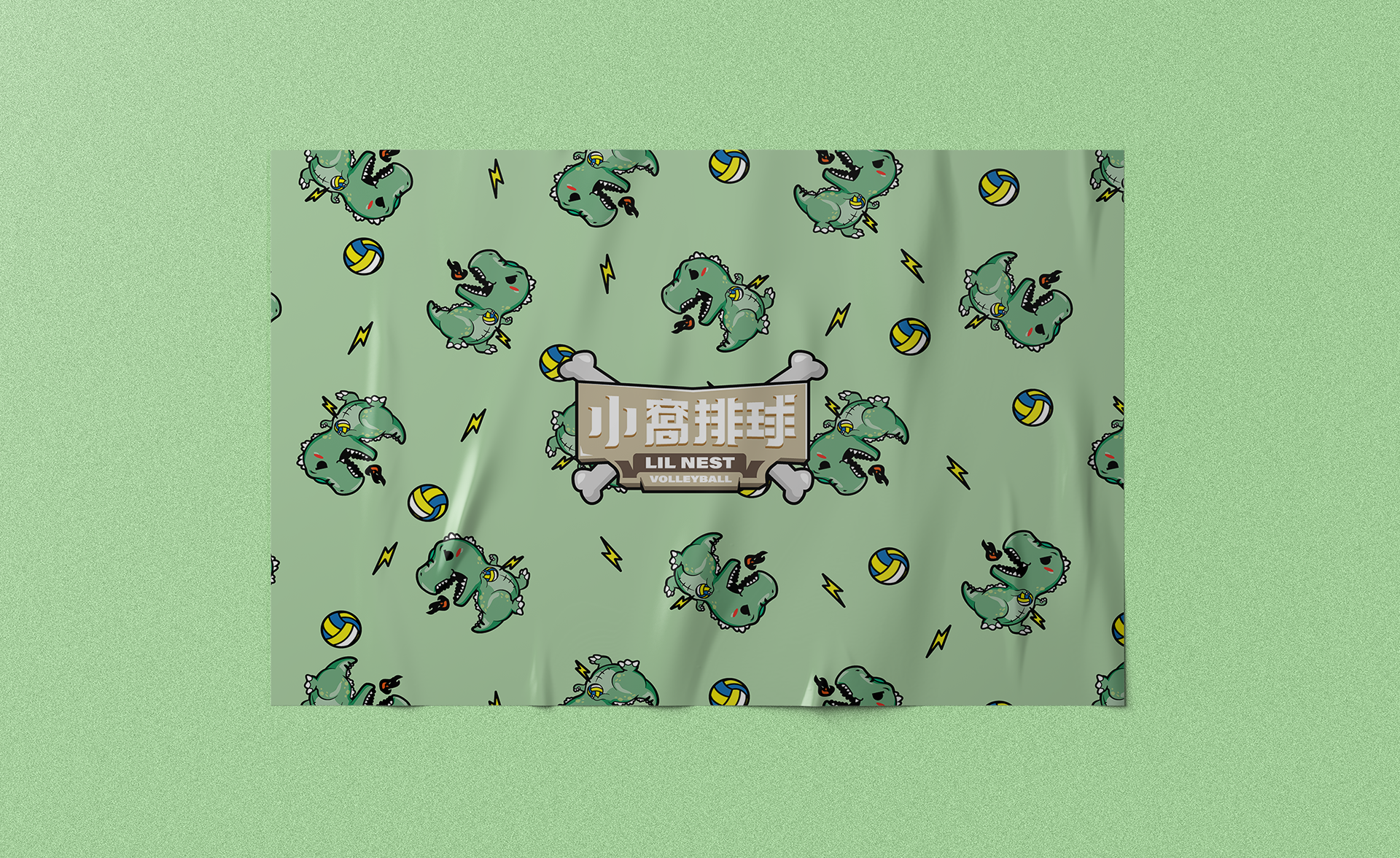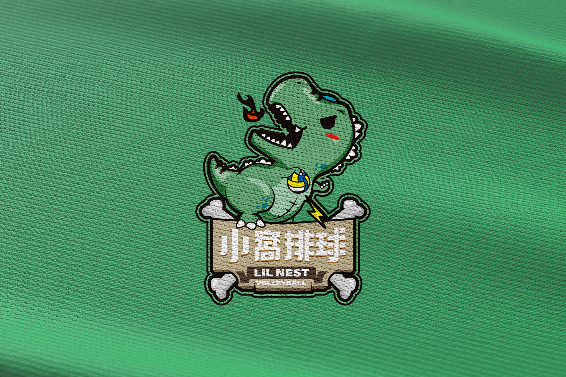 小窩排球的LOGO設計以美式Q版插畫風格呈現,圖案上是一隻手持排球並口吐火焰的小暴龍。文字設計則以骨頭與木板作為元素,整體呈現原始又富有活力的印象,表現出對排球的熱情與熱血。希望能給人們一種充滿活力的印象,呈達對排球的熱愛。