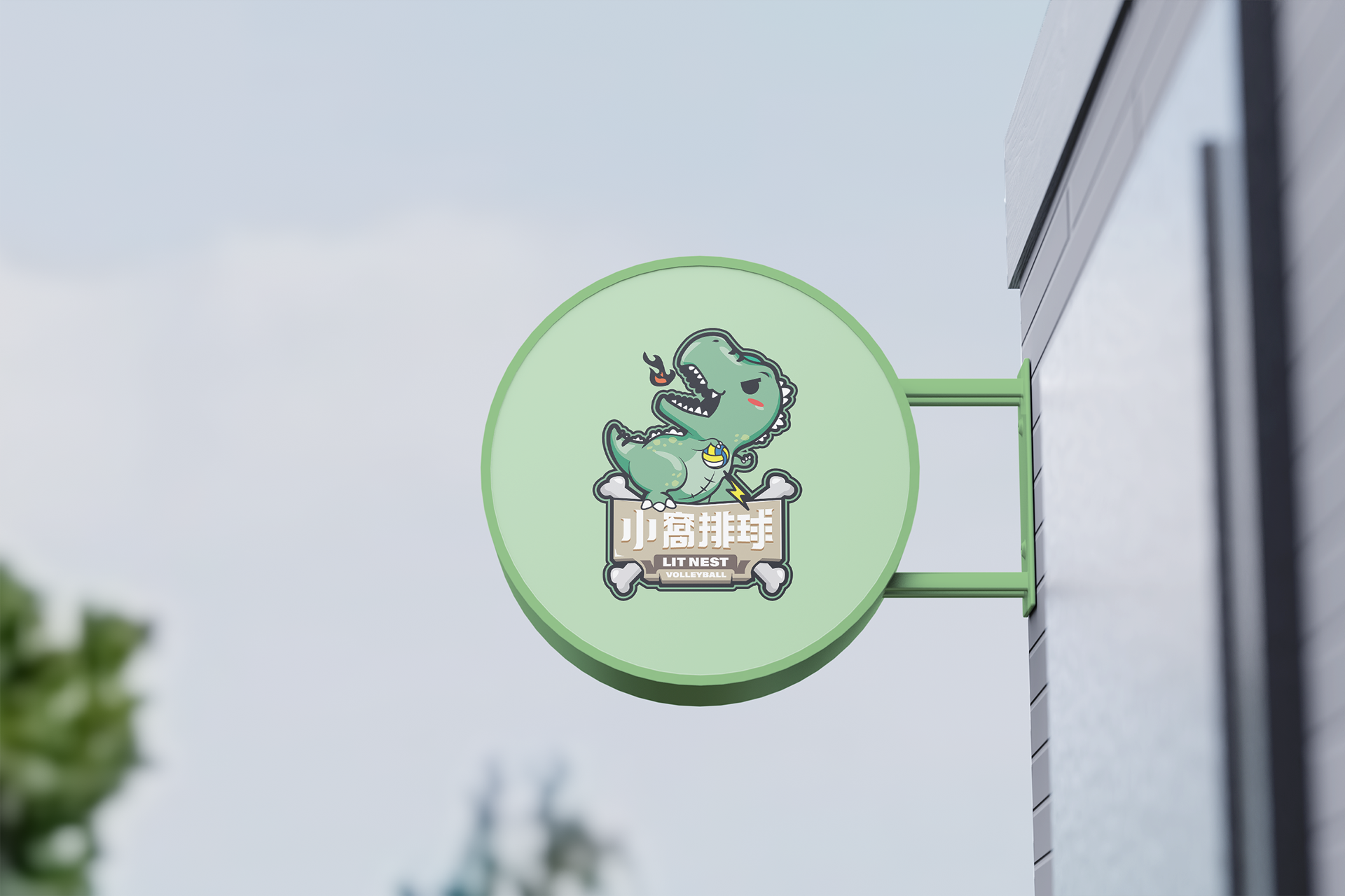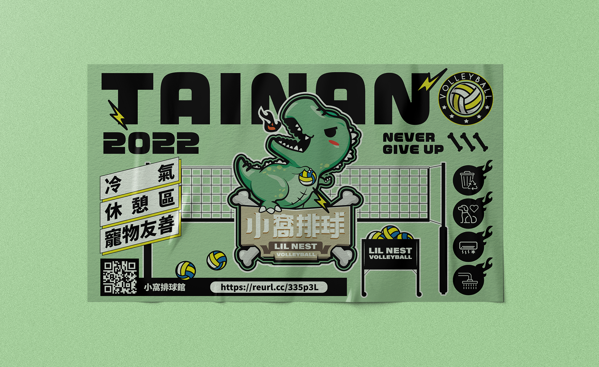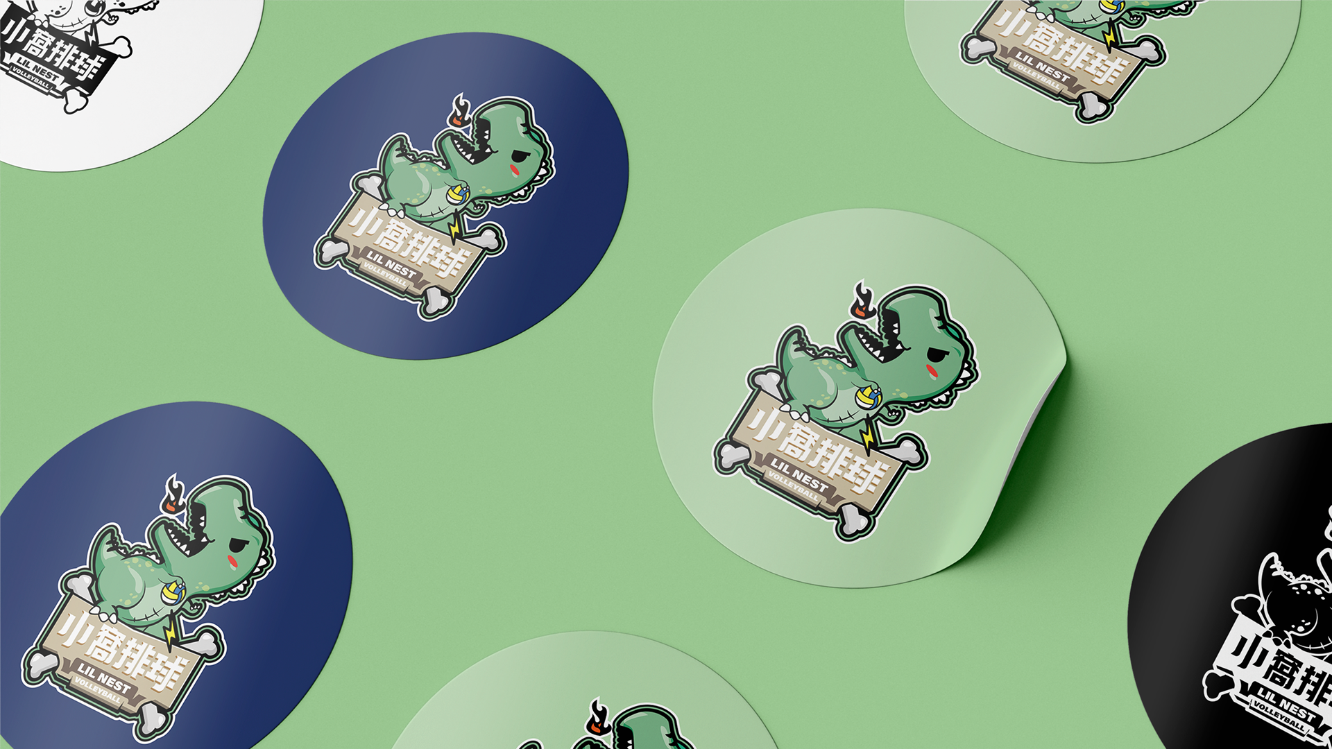 小窩排球的LOGO設計以美式Q版插畫風格呈現,圖案上是一隻手持排球並口吐火焰的小暴龍。文字設計則以骨頭與木板作為元素,整體呈現原始又富有活力的印象,表現出對排球的熱情與熱血。希望能給人們一種充滿活力的印象,呈達對排球的熱愛。